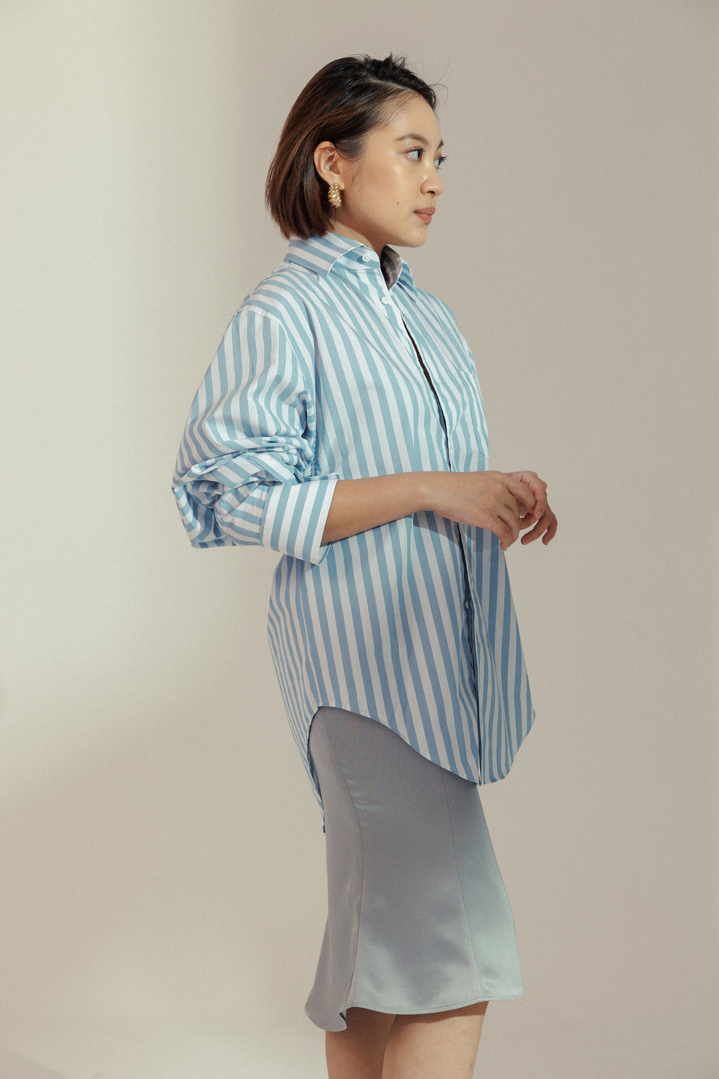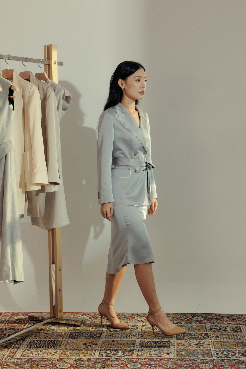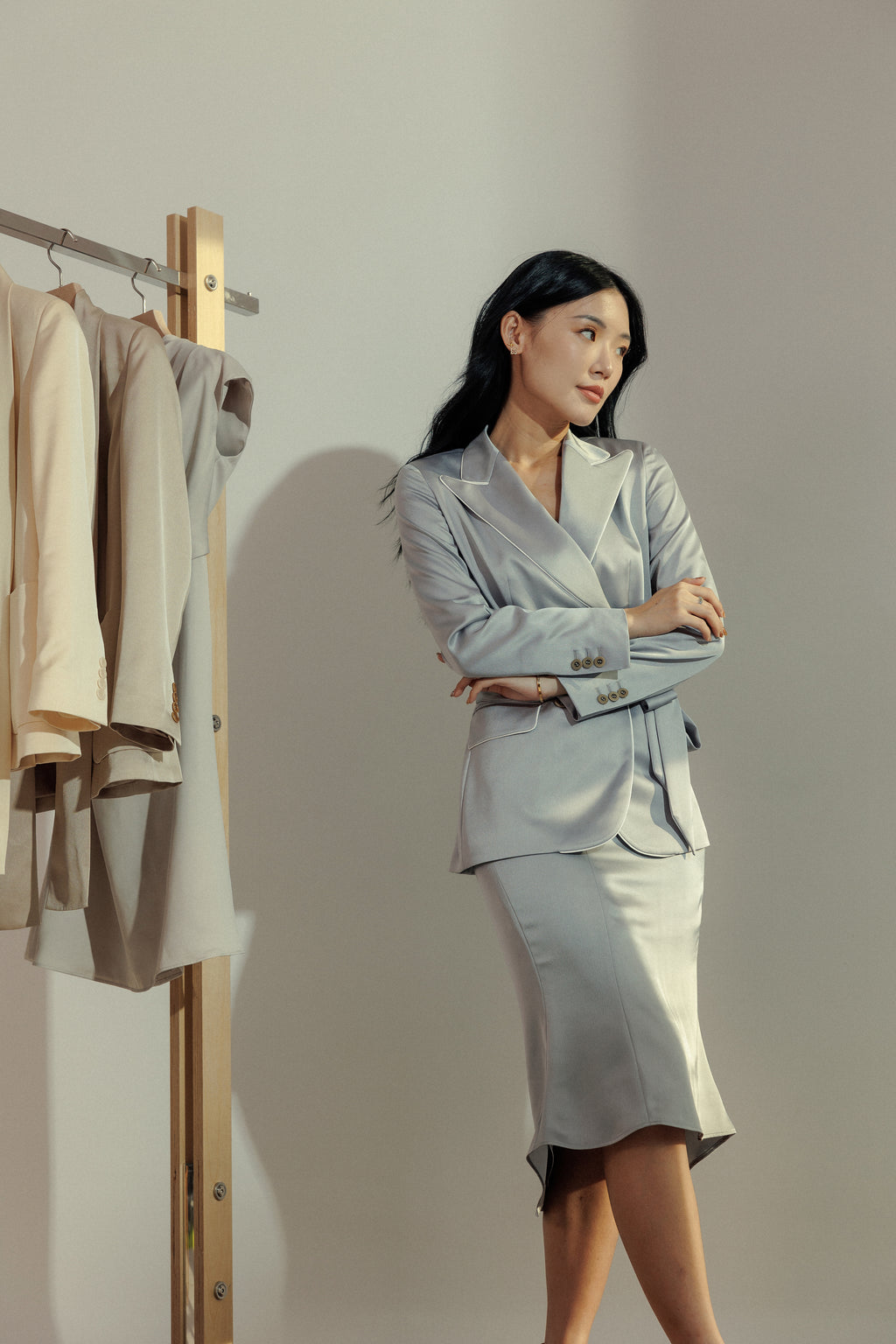 Inspired by a lifestyle that centers on functional and investment dressing, where luxury meets craft and creativity. Our Asymmetrical Satin Midi Skirt hugs your waist and hips, with a slight flare at the hem, creating a flattering silhouette. This skirt features an asymmetrical hem that falls longer at the back. Pair it with our matching Satin Peak Lapel Belted Blazer to complete the look. Available in two colourways - Rośe and Melange.