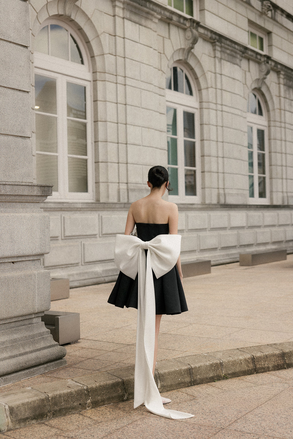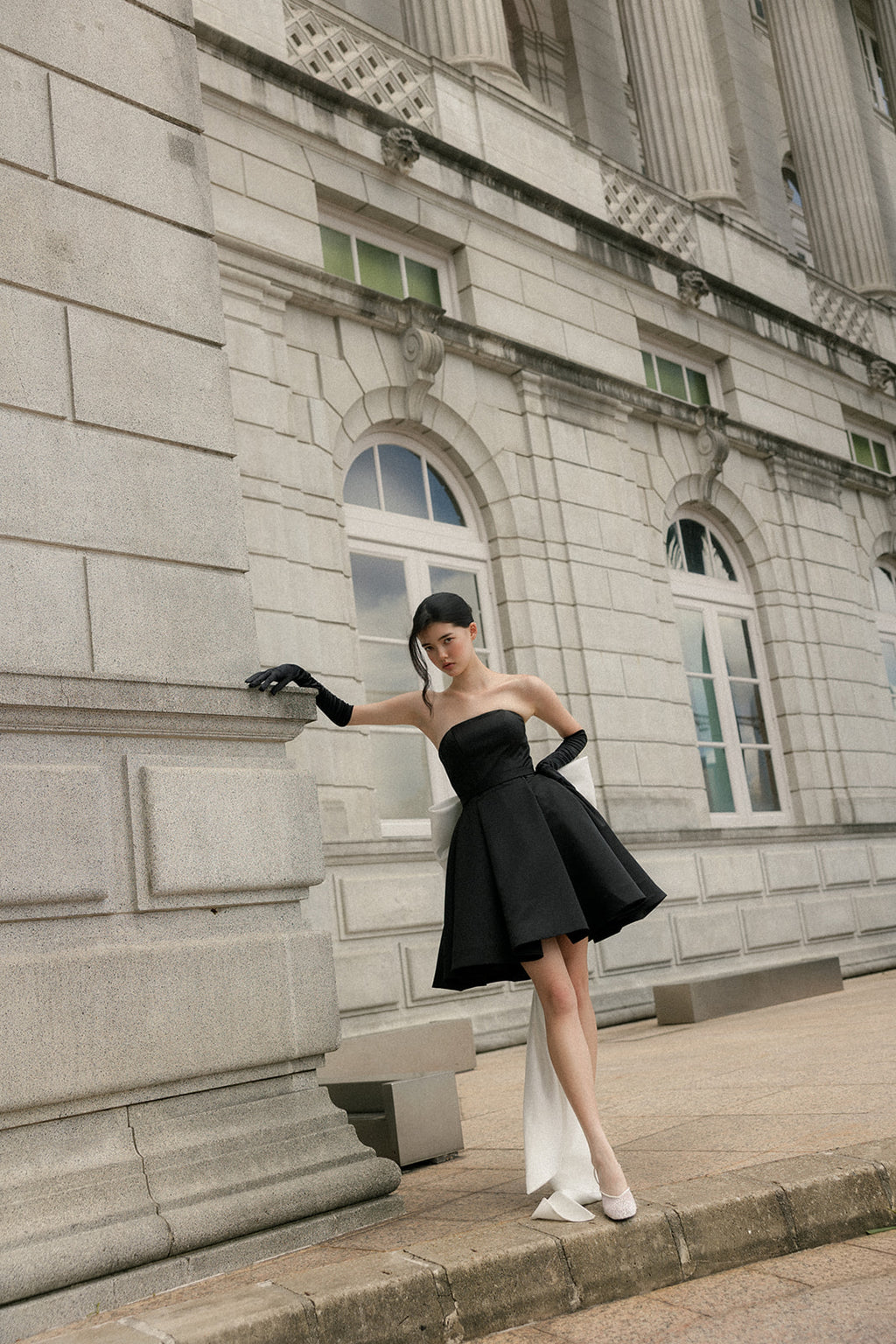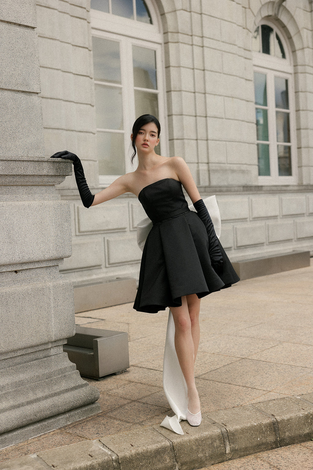 Cut with a clean strapless neckline, the bodice holds its line with quiet confidence, anchoring the silhouette before giving way to a fluid skirt that moves freely with the body. The contrast is intentional: disciplined above, relaxed below. Nothing is forced, nothing overstated.