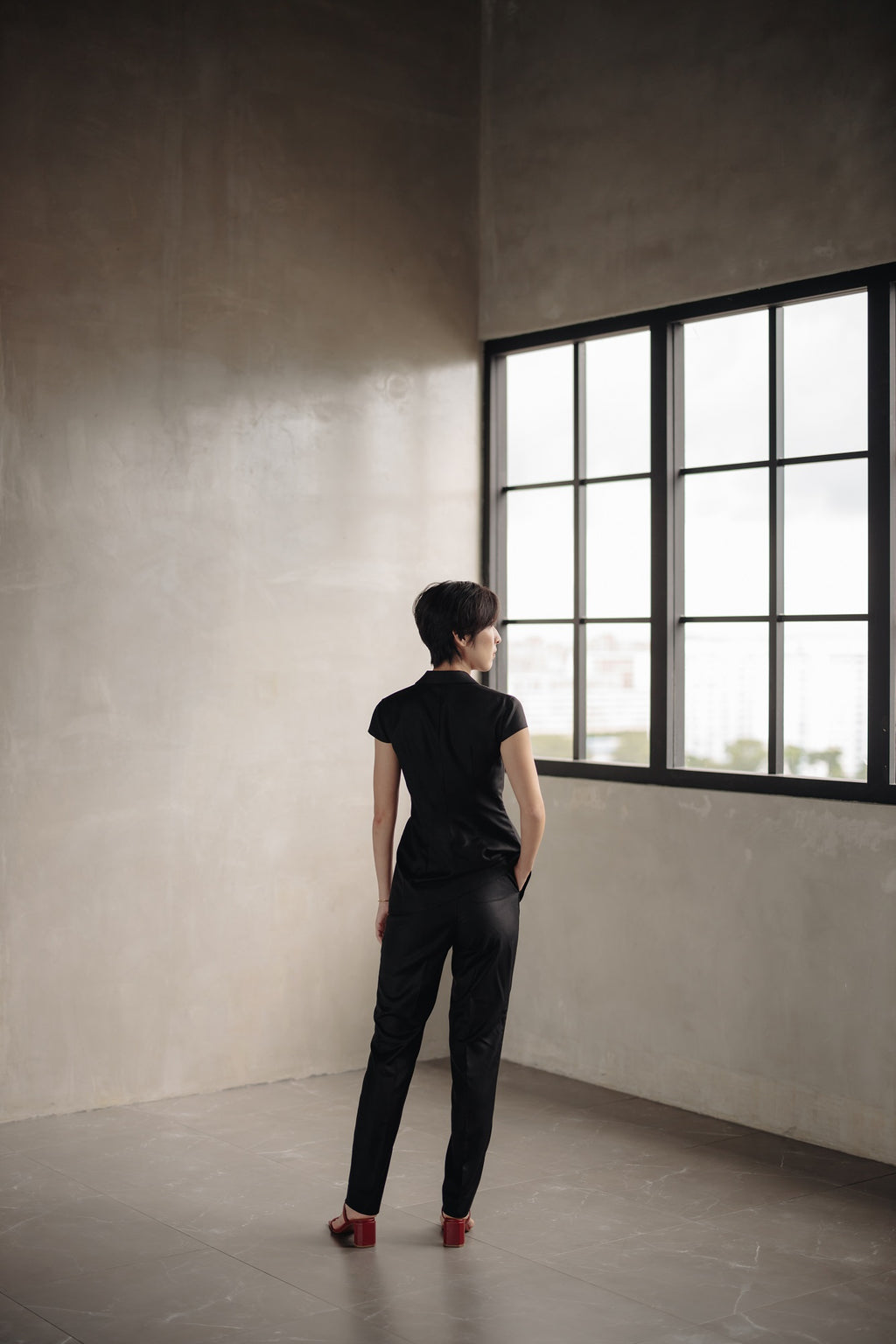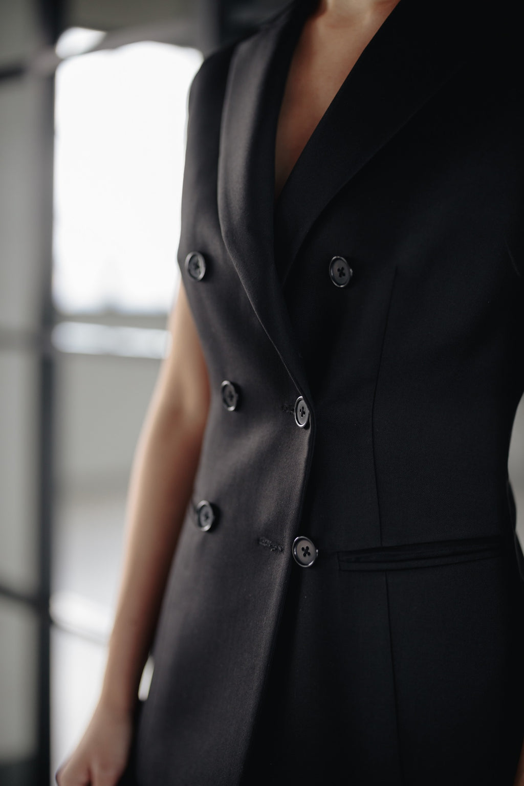 Here's a little swap from your long sleeved formal jackets, just right for Singapore's tropical weather. Being a classic black jacket, the double breasted look with 2 symmetrical columns of buttons jazz up the simple look.