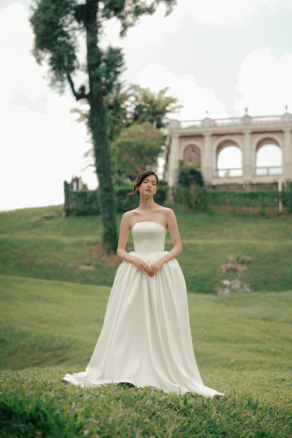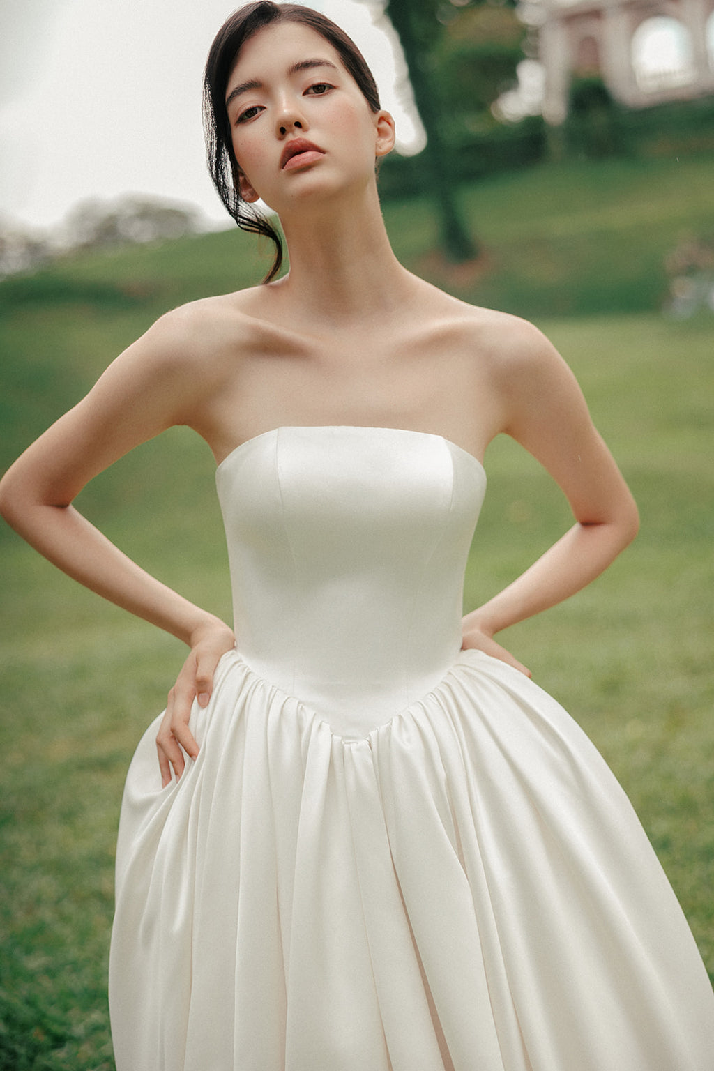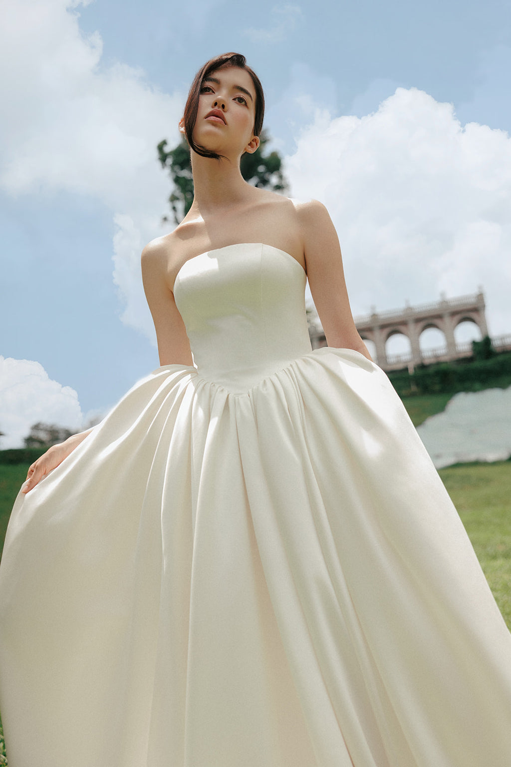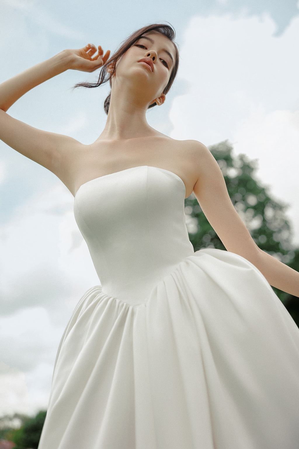 Anoria is defined by openness and scale. The bodice is kept clean and uncomplicated, framing the upper body before giving way to a full skirt that holds volume with ease rather than weight.