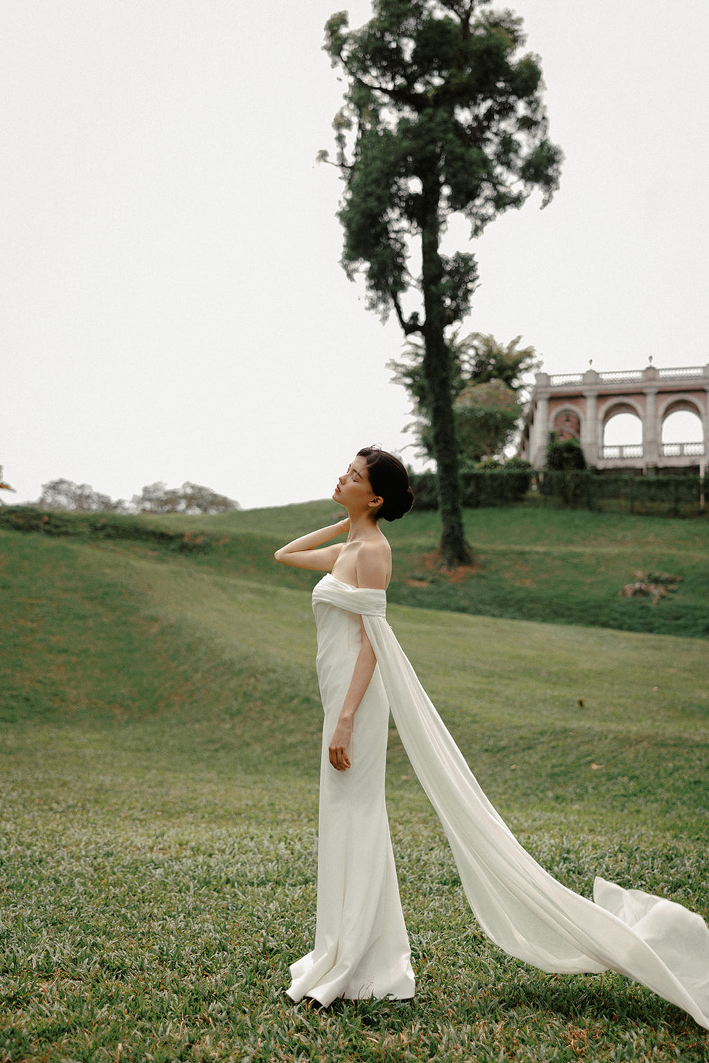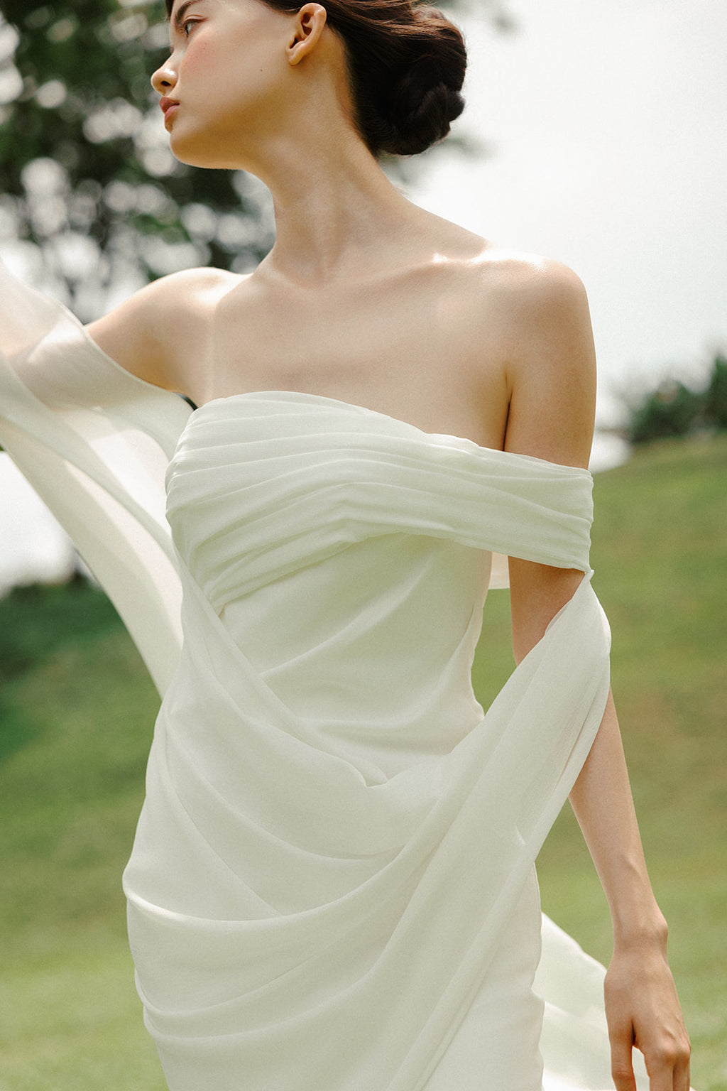 The silhouette remains fluid from bodice to hem, extending into a gentle train that moves with ease rather than formality. Nothing is fixed or rigid; the gown follows the wearer, responding to motion and air instead of holding its own shape.
