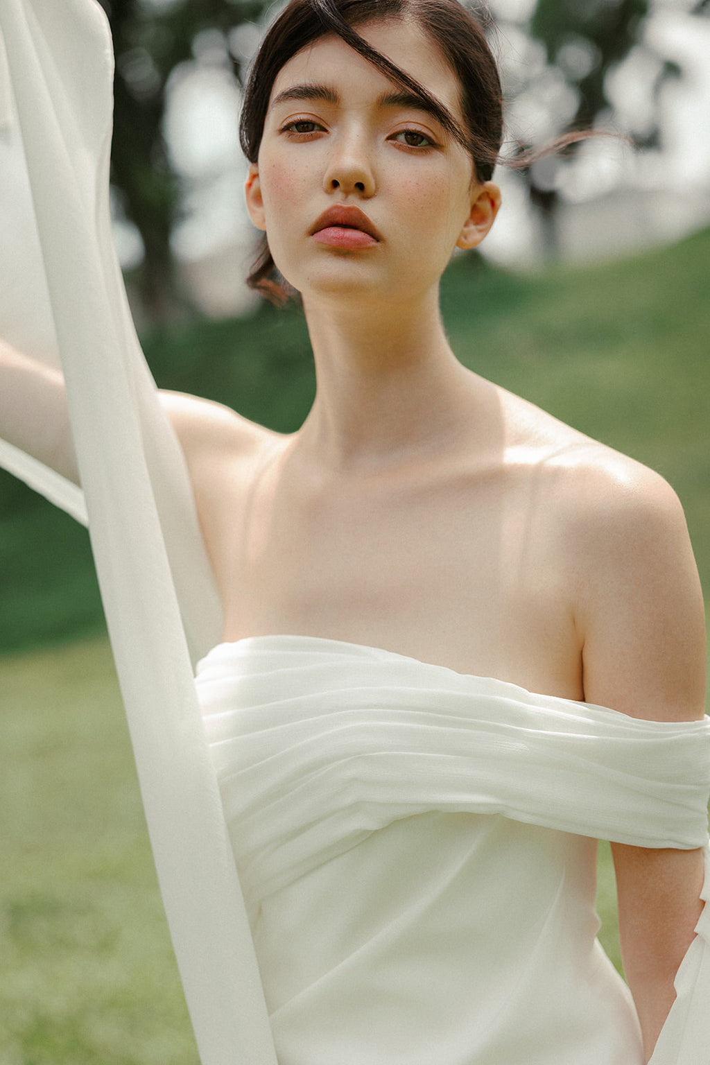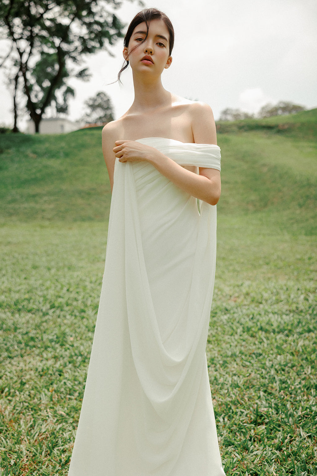 Lilit is shaped through drape rather than structure. The neckline falls softly off the shoulders, allowing fabric to gather and release naturally across the body.