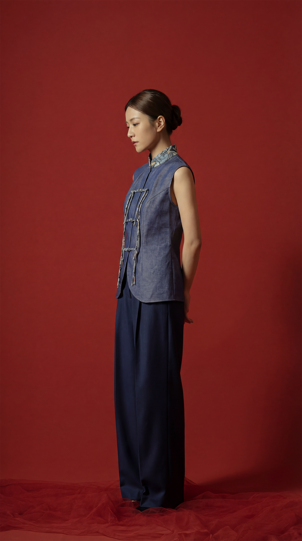 The REN Mandarin Top is crafted in denim with soft pleats gathered at the collar, creating a subtle sense of structure and movement. Floral button detailing adds a quiet decorative note, balancing utility with refinement. A modern interpretation of the mandarin top, designed for ease and understated elegance.